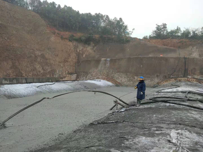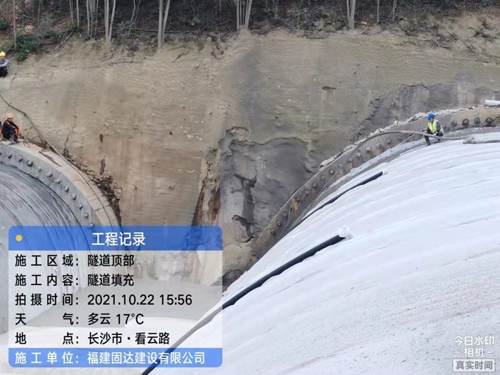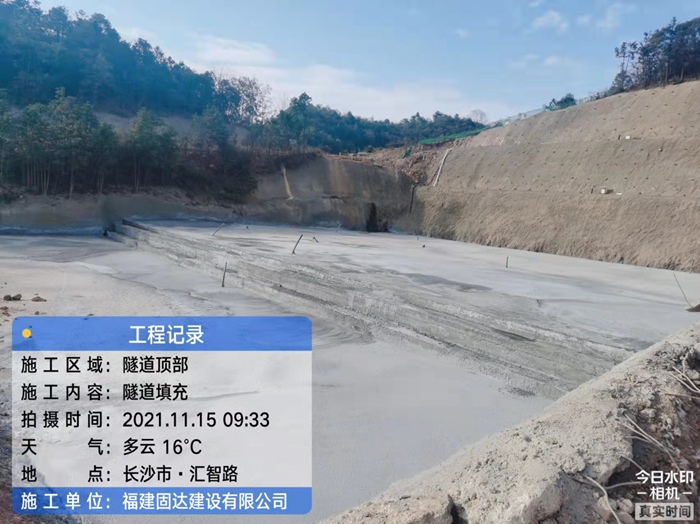 工程概况:长沙市夏鹃路下穿智慧公园隧道项目位于夏鹃路路段中段,雪松路以及龙柏路交叉口之间,下穿规划智慧公园现状山体。连拱隧道全长320米,双向八车道,隧道单个主洞开挖宽度18.9米,属特大跨,全断面开挖轮廓面积为186平方米。在隧道顶部将气泡混合轻质土做为回填材料,可大大减少荷载,控制沉降量,有效接推进相关管线及后续工程的顺利进行。